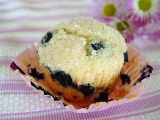 These were fairly easy to make and were light and tender. Like I said, I'm always in search of a good blueberry muffin and these were good. I think they could have browned a little more on top, but the sugar kept them from getting golden, and I didn't want to over bake them. They would be excellent with about 1/2 c. more blueberries and a streusel topping- yum!