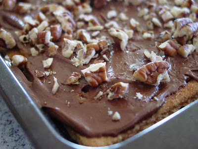 6). Sprinkle with chopped pecans. Carefully press the nuts into the chocolate so they stick, but be careful because they're HOT!